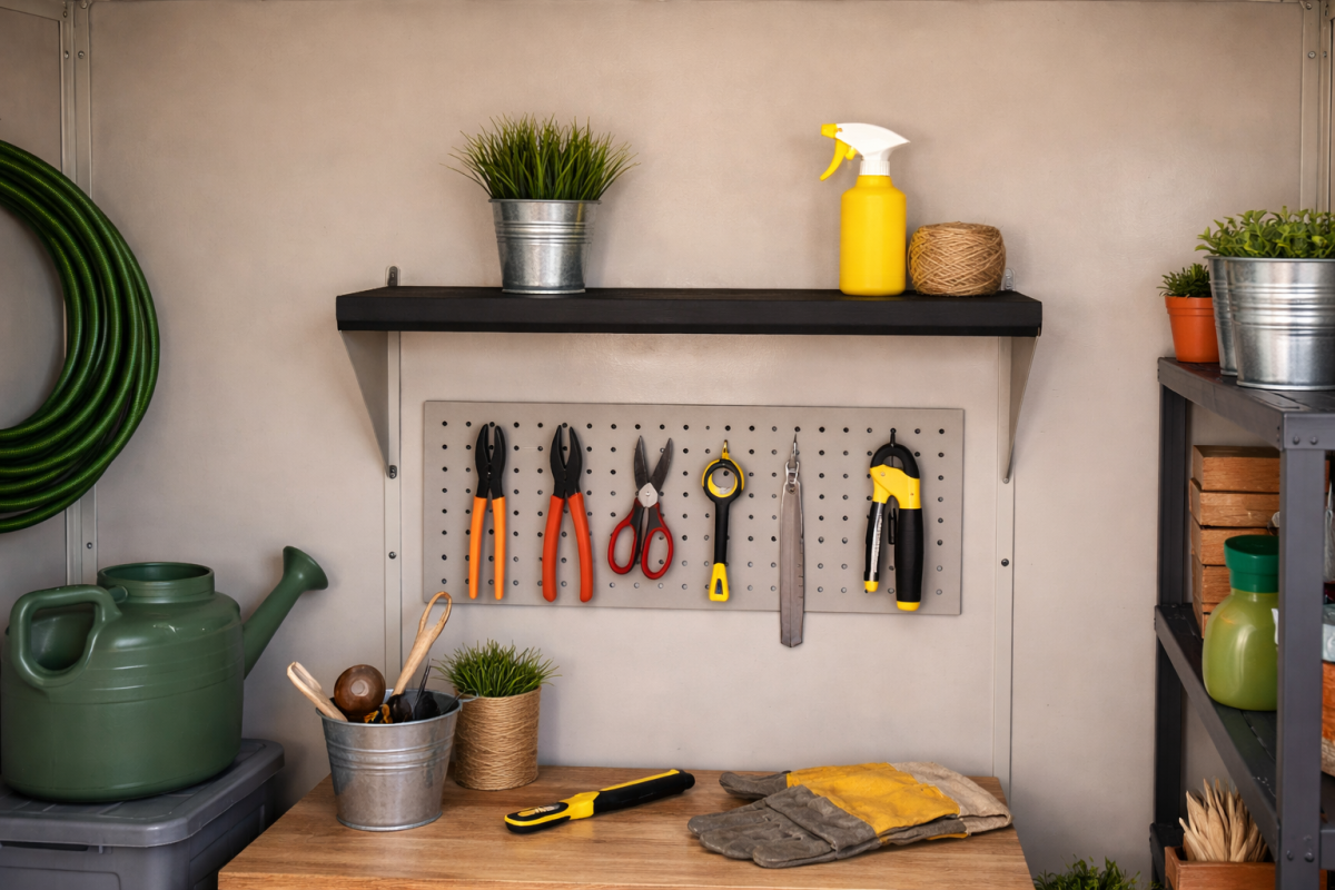 Použitie: Ideálne na uskladnenie ručného náradia, hnojív, prípravkov na ochranu rastlín, kvetináčov, záhradného príslušenstva a iných drobných predmetov, ktoré vyžadujú ľahký prístup a organizáciu.